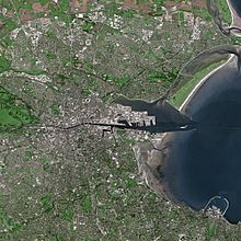 Satellite image showing the River Liffey entering the Irish Sea as it divides Dublin into the Northside and the Southside.