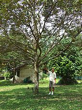 A juvenile durian tree, compared to human height. Mature specimens can grow up to 50 metres (164 ft).