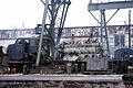 A former Baltimore and Ohio Railroad F7A falls under the cutting torch at the Naporano Iron & Scrap Works in Newark, New Jersey in 1975. The majority of the carbody has been removed, exposing the sixteen-cylinder EMD 567 series prime mover.