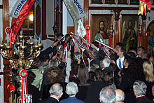 In Polish culture, The Rezurekcja (Resurrection Procession) is the joyous Easter morning Mass at daybreak when church bells ring out and explosions resound to commemorate Christ rising from the dead. Before the Mass begins at dawn, a festive procession with the Blessed Sacrament carried beneath a canopy encircles the church. As church bells ring out, handbells are vigorously shaken by altar boys, the air is filled with incense and the faithful raise their voices heavenward in a triumphant rendering of age-old Easter hymns. After the Blessed Sacrament is carried around the church and Adoration is complete, the Easter Mass begins. Another Polish Easter tradition is Święconka, the blessing of Easter baskets by the parish priest on Holy Saturday. This custom is celebrated not only in Poland, but also in the United States by Polish-Americans.