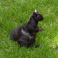As the name suggests, the eastern gray squirrel's fur is predominantly gray but it can have a reddish tinge. Its belly is white and it has a large bushy tail. Particularly in urban situations where the risk of predation is reduced, both white- and black-colored squirrels are quite often found. The melanistic form, which is almost entirely black, is predominant in certain populations and in certain geographic areas, such as in large parts of southeastern Canada. There are also genetic variations within these, including gray squirrels with black tails and black colored gray squirrels with white tails.