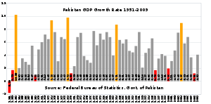 Historically, Pakistan's overall economic output (GDP) has grown every year since a 1951 recession. Despite this record of sustained growth, Pakistan's economy had, until a few years ago, been characterized as unstable and highly vulnerable to external and internal shocks. However, the economy proved to be unexpectedly resilient in the face of multiple adverse events concentrated into a four-year (1998–2002) period —