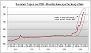 Since the beginning of 2008, Pakistan's economic outlook has taken a dramatic downturn. Security concerns stemming from the nation's role in the War on Terror have created great instability and led to a decline in FDI from a height of approximately $8 bn to $3.5bn for the current fiscal year. Concurrently, the insurgency has forced massive capital flight from Pakistan to the Gulf. Combined with high global commodity prices, the dual impact has shocked Pakistan's economy, with gaping trade deficits, high inflation and a crash in the value of the Rupee, which has fallen from 60–1 USD to over 80-1 USD in a few months. For the first time in years, it may have to seek external funding as Balance of Payments support. Consequently, S&P lowered Pakistan’s foreign currency debt rating to CCC-plus from B, just several notches above a level that would indicate default. Pakistan’s local currency debt rating was lowered to B-minus from BB-minus. Credit agency Moody’s Investors Service cut its outlook on Pakistan’s debt to negative from stable due to political uncertainty, though it maintained the country’s rating at B2.The cost of protection against a default in Pakistan’s sovereign debt trades at 1,800 basis points, according to its five-year credit default swap, a level that indicates investors believe the country is already in or will soon be in default.