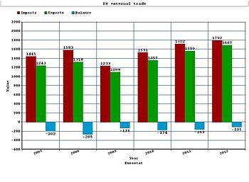 EU  imports,  exports and  balance of trade in  goods from 2007 to 2011 (in  billions of euro)
