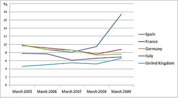 UnemploymentThe seasonally adjusted unemployment rate in the European Union (EU27) in March 2009 was 8.3% compared to 6.7% in March 2008. The Eurozone (EA16) unemployment figure for January 2009 was 8.2% compared to 7.3% in January 2008. The unemployment rate (EU25) had previously declined in prior years from 8.9% in March 2005 to 8.4% in March 2006 to 7.3% in March 2007. The rate varies widely by member state. There has been a steep upturn in the unemployment rate since 2008 due to the worldwide credit crunch and following recession. The countries within the EU which were most affected were Spain, Ireland and the Baltic countries with the unemployment rate doubling or in case of the Baltic countries nearly tripling. By comparison in March 2009 the United States had an unemployment rate of 8.6% (2008: 5.1; 2007: 4.4; 2006: 4.7) which was higher than the EU-27's unemployment rate but lower than the EU-16 Eurozone rate of 8.9%. Japan's unemployment rate remained comparatively steady at 4.4% (2008: 3.9; 2007: 4.0; 2006: 4.1). The following tables show the current unemployment rate of all Member States for March 2009 with comparisons to March 2008, 2007, 2006 and 2005 and comparisons to the United States and Japan:
