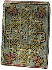 The Miroir or Glasse of the Synneful Soul, a translation from the French, by Elizabeth, presented to Catherine Parr in 1544. The embroidered binding with the monogram KP for "Katherine Parr" is believed to have been worked by Elizabeth.