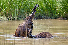 Emus drink at infrequent intervals, but ingest large amounts when they do so. They typically inspect the water body in groups for a period before kneeling down at the edge of the water and drinking. They are observed to prefer kneeling on solid earth while drinking, rather than in rocks or mud, presumably due to a fear of sinking. They often drink continuously for 10 minutes, unless disturbed by danger, in which case they interrupt themselves to deal with the threat before resuming. Due to the arid environment, they often go one or two days without finding a source of water and drinking. They typically drink once per day or night, but can do so several times daily if supply is abundant. In the wild, they often share water sources with kangaroos, other birds and wild camels and donkeys that were let loose by European settlers. Emus are suspicious of these other species and tend to wait in bushes and wait for other types of animals to leave; they choose to drink separately to the other animals. If an emu senses abnormal circumstances or a threat, it drinks while standing.