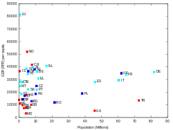Population and GDP per capita of individual EU member states compared with those of non-member states in Europe.