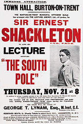 Sir Ernest Henry Shackleton, CVO, OBE FRGS ( / ˈ ʃ æ k əl t ən /; 15 February 1874 – 5 January 1922) was an Anglo-Irish polar explorer who led three British expeditions to the Antarctic, and one of the principal figures of the period known as the Heroic Age of Antarctic Exploration. Born in County Kildare, Ireland, Shackleton and his family moved to Sydenham in suburban London when he was ten. His first experience of the polar regions was as third officer on Captain Robert Falcon Scott's Discovery Expedition, 1901–04, from which he was sent home early on health grounds. Determined to make amends for this perceived personal failure, he returned to Antarctica in 1907 as leader of the Nimrod Expedition. In January 1909 he and three companions made a southern march which established a record Farthest South latitude at 88° 23′ S, 97 geographical miles (112 statute miles, 180 km) from the South Pole, by far the closest convergence in exploration history up to that time. For this achievement, Shackleton was knighted by King Edward VII on his return home.
