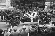 The official story of Rommel's death, as initially reported to the general public, stated that Rommel had either suffered a heart attack or succumbed to his injuries from the earlier strafing of his staff car. To further strengthen the story, Hitler ordered an official day of mourning in commemoration and Rommel was buried with full military honours. Hitler sent Field Marshal von Rundstedt as his representative at Rommel's funeral. Rommel had specified that no political paraphernalia were to be displayed on his corpse, but the Nazis made sure he was fully festooned with swastikas. The truth behind Rommel's death became known to the allies when intelligence officer Charles Marshall interviewed Rommel's widow, Lucia Rommel, in April 1945. Broad knowledge to the public did not come out until Keitel testified about it during the Nuremberg Trials.