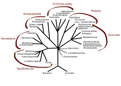 As of 2011, there is widespread agreement that the Rhizaria belong with the Stramenopiles and the Alveolata, in a clade dubbed the SAR supergroup, so that Rhizara is not one of the main eukaryote groups; also that the Amoeboza and Opisthokonta are each monophyletic and form a clade, often called the unikonts. Beyond this, there does not appear to be a consensus.