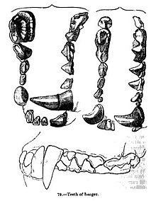 European badger skulls are quite massive, heavy and elongated. Their braincases are oval in outline, while the facial part of their skulls is elongated and narrow. Adults have prominent sagittal crests which can reach 15 mm tall in old males, and are more strongly developed than those of honey badgers. Aside from anchoring the jaw muscles, the thickness of the crests protect their skulls from hard blows. Similar to martens, the dentition of European badgers is well-suited for their omnivorous diets. Their incisors are small and chisel-shaped, their canine teeth are prominent and their carnassials are not overly specialised. Their molars are flattened and adapted for grinding. Their jaws are powerful enough to crush most bones; a provoked badger was reported as biting down on a man's wrist so severely, it had to be amputated. The dental formula is: