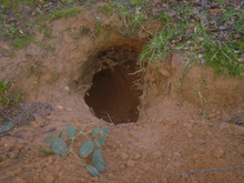 Like other badger species, European badgers are burrowing animals. However, the dens they construct (called setts) are the most complex, and are passed on from generation to generation. The number of exits in one sett can vary from a few to 44-50. These setts can be vast, and can sometimes accommodate multiple families. In the latter case, several isolated passages and nesting chambers occur. Some setts may have exits which are only used in times of danger or play. A typical sett has a 22–63 cm (8.7–25 in) wide base and a 14–32 cm (5.5–13 in) height. Three nesting chambers occur in setts, some of which are open both ends. The nesting chamber is located 5–10 m (5.5–11 yd) from the opening, and is situated more than a 1 m (1 yd) underground, in some cases 2.3 m (2.5 yd). Generally, the passages are 35–81 m (38–89 yd) long. The nesting chamber is on average 74 cm × 76 cm (29 in × 30 in), and are 38 cm (15 in) high. Badgers dig and collect bedding throughout the year, particularly in autumn and spring. Sett maintenance is usually carried out by subordinate sows and dominant boars. The sett chambers are frequently lined with bedding, which is brought in on dry nights, consisting of grass, bracken, straw, leaves or moss. Up to 30 bundles can be carried to the sett on a single night. They are fastidiously clean animals, which regularly discard old bedding. During the winter, they may take their bedding outside on sunny mornings and retrieve it later. Spring cleaning is connected to the birth of cubs, and may occur several times during the summer to prevent parasite infestations. If a badger dies within a sett chamber, its conspecifics will seal off the chamber and dig a new one. Some badgers will drag their dead out of the sett and bury them outside. A sett is almost invariably located near a tree, which is used by badgers for stretching or claw scraping. Badgers defecate in latrines, which are located near the sett and at strategic locations on territorial boundaries or near places with abundant food. In extreme cases, when there is a lack of suitable burrowing grounds, badgers will move into haystacks in winter. They may share their earths with red foxes or European rabbits. Rabbits may benefit from the presence of badgers as protection against other predators, and usually avoid predation from the badgers themselves by burrowing in smaller, hard to reach chambers.