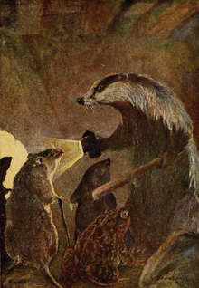 In Kenneth Graham's The Wind in the Willows, Mr. Badger is depicted as a gruff, solitary figure who "simply hates society", yet is a good friend to Mole and Ratty. A friend of Toad's now-deceased father, he is often firm and serious with Toad, but at the same time generally patient and well-meaning towards him. He can be seen as a wise hermit, a good leader and gentleman, embodying common sense. He is also brave and a skilled fighter, and helps clear the Wild Wooders from Toad Hall. A villainous badger named Tommy Brock appears in Beatrix Potter's 1912 book The Tale of Mr. Tod, where he is shown kidnapping the children of Benjamin Bunny and his wife Flopsy, and hides them in an oven in the home of Mr. Tod the fox, with whom he fights in the book's conclusion. The book's portrayal of the badger as a filthy animal which appropriates fox dens was criticised from a naturalistic viewpoint, though the inconsistencies are few and employed to create individual characters rather than evoke an archetypical fox and badger. A wise old badger named Trufflehunter appears in C. S. Lewis' Prince Caspian, where he aids Caspian X in his struggle against King Miraz. A badger takes a prominent role in Colin Dann's The Animals of Farthing Wood series as second in command to Fox. The badger is also the house symbol for Hufflepuff in the "Harry Potter" book series. The Redwall series also has the Badger Lords, who rule the extinct volcano fortress of Salamandastron and are renowned as fierce warriors. The children's television series Bodger and Badger was a popular on CBBC during the 1990s, set around the mishaps of a mashed potato loving badger and his human companion.