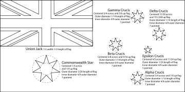 The outer diameter of the Commonwealth Star is 3/10 of the flag's width, while that of the stars in the Southern Cross is 1/7 of the flag's width, except for Epsilon, for which the fraction is 1/12. Each star's inner diameter is 4/9 of the outer diameter. The flag's width is the measurement of the hoist edge of the flag (the distance from top to bottom).