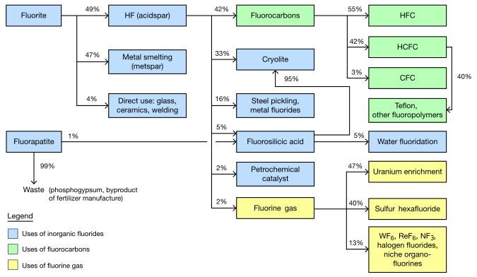 Because of the difficulty in making elemental fluorine, most fluorine used in commerce is never converted to free fluorine. Instead, hydrofluoric acid is the key intermediate for the $16 billion per year global fluorochemical industry. The fluorides of low charged metals are ionic compounds (salts); those of high charged metals are volatile molecular compounds. The largest uses of inorganic fluorides are steel making and aluminium refining.