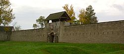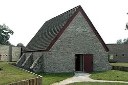Partial reconstruction of the fort's walls on the original foundations followed in 1989. The frames of some additional buildings were erected as a display of the post-and-beam construction techniques used for the originals. Other buildings' foundations and cellars were exposed for educational display as well.