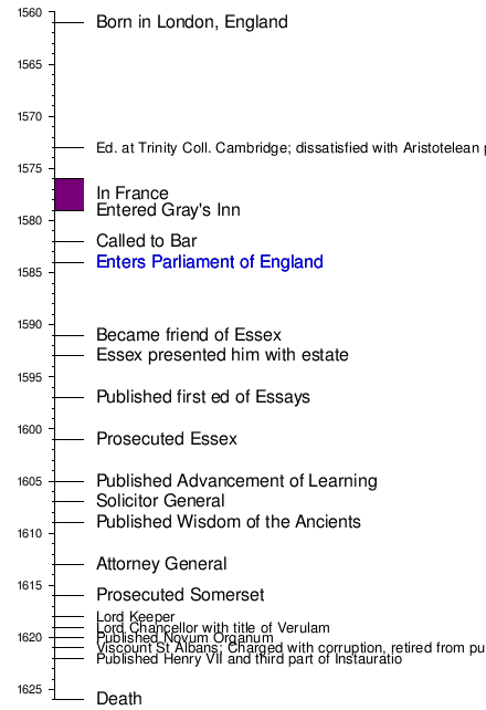 In 1584, he took his seat in parliament for Melcombe of Dorset, and subsequently for Taunton (1586). He wrote on the condition of parties in the church, and he wrote about philosophical reform in the lost tract, Temporis Partus Maximus. Yet, he failed to gain a position he thought would lead him to success. He showed signs of sympathy to puritanism, attending the sermons of the puritan chaplain of Gray's Inn and accompanying his mother to the Temple chapel to hear Walter Travers. This led to the publication of his earliest surviving tract criticising the English church's suppression of the puritan clergy. In the Parliament of 1586, openly, he urged execution for Mary Queen of Scots.