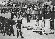 Before the attempted execution, the members were split into three-man groups. Dostoyevsky was the third in the second row (not seen on the picture). Next to him stood Pleshcheyev and Durov.