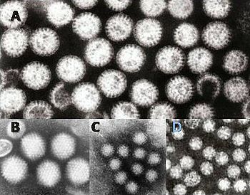 Gastroenteritis viruses: A = rotavirus, B = adenovirus, C = Norovirus and D = Astrovirus. The virus particles are shown at the same magnification to allow size comparison.