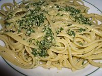 Popular foods local to Genoa include pesto sauce, focaccia, farinata, stoccafisso ( stockfish), and salsa di noci (walnut sauce). Pasta (usually trofie) al Pesto is probably the most iconic among Genoese foods. Pesto sauce is prepared with fresh basil, pine nuts, grated parmesan, garlic and olive oil pounded together. Another popular dish which is common to Genoa is the minestrone, a thick soup made out of several vegetables and legumes, such as potatoes, beans, green beans, cabbages, pumpkins and zucchini. Other soup dishes which are common to the city include the fish-consisting ciuppin (the precursor to San Francisco's cioppino, buridda, zemin (a soup with garbanzo beans), sbira and preboggion. Other specialties are Ravioli al sugo (Ravioeu ao tocco), Pansoti di Rapallo (round ravioli filled with hard-boiled egg, spinach and grated cheese), Cappon Magro, Pandolce (Pandoçe) and Sacripantina. Is also known for its cheese filled pizza crust (focaccia al formaggio), although it is mainly typical of Recco (a town in the eastern Riviera), not far from Genoa.