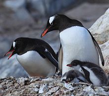 The long-tailed Gentoo penguin (pron.: / ˈ dʒ ɛ n t uː / JEN-too), Pygoscelis papua, is a penguin species in the genus Pygoscelis, most closely associated with the Adélie penguin (P. adeliae) and the Chinstrap penguin (P. antarcticus). The first scientific description was made in 1781 by Johann Reinhold Forster on the basis of Falkland Islands. They call in a variety of ways, but the most frequently heard is a loud trumpeting which is emitted with its head thrown back.