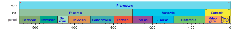 • 542± 0.3 Ma: Cambrian explosion – vast multiplication of hard-bodied life; first abundant fossils; start of the Paleozoic