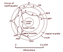 Earth layered structure. Typical wave paths from earthquakes like these gave early seismologists insights into the layered structure of the Earth
