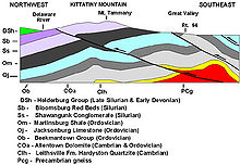 Geologic cross-section of Kittatinny Mountain. This cross-section shows metamorphic rocks, overlain by younger sediments deposited after the metamorphic event. These rock units were later folded and faulted during the uplift of the mountain.