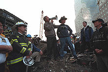 The September 11 terrorist attacks were a major turning point in Bush's presidency. That evening, he addressed the nation from the Oval Office, promising a strong response to the attacks. He also emphasized the need for the nation to come together and comfort the families of the victims. On September 14, he visited Ground Zero, meeting with Mayor Rudy Giuliani, firefighters, police officers, and volunteers. Bush addressed the gathering via a megaphone while standing on a heap of rubble, to much applause: "I can hear you. The rest of the world hears you. And the people who knocked these buildings down will hear all of us soon."