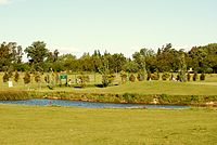 It is one of the few ball games that does not require a standardized playing area. Instead, the game is played on a golf course, generally consisting of an arranged progression of either 9 or 18 "holes". Each hole on the course must contain a "tee box" to start from and a "putting green" with the actual hole, and there are various other standardized forms of terrain in between such as the fairway, rough, and hazards, but each hole on a course and indeed among virtually all courses is unique in its specific layout and arrangement.