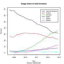 Chrome overtook Firefox in November 2011. As of September 2012, according to StatCounter, Google Chrome had 34% worldwide usage share, making it the most widely used web browser, while Internet Explorer had 33% and Firefox had 22%.