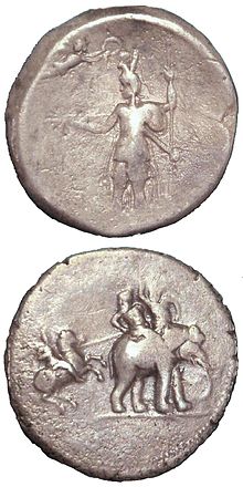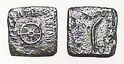 Some of the coins of Menander I and Menander II incorporate the Buddhist symbol of the eight-spoked wheel, associated with the Greek symbols of victory, either the palm of victory, or the victory wreath handed over by the goddess Nike. According to the Milinda Pañha, at the end of his reign Menander I became a Buddhist arhat, a fact also echoed by Plutarch, who explains that his relics were shared and enshrined.