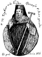 ![]() Bishop Germanos of old Patras blesses the Greek banner at Agia Lavra on the outset of the national revolt against the Turks on 25 March 1821. Oil painting by Theodoros Vryzakis, 1851.  |