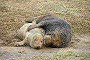 The Grey Seal (Halichoerus grypus, meaning hooked nosed sea pig) is found on both shores of the North Atlantic Ocean. It is a large seal of the family Phocidae or "true seals". It is the only species classified in the genus Halichoerus. Its name is alternatively spelled Gray Seal and it is also known as Atlantic Grey Seal.
