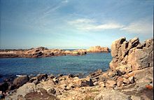 At 49°28′N 2°35′W, Alderney, Guernsey, Herm, Sark, and some other smaller islands have a total area of 78 square kilometres (30 sq mi) and a coastline of about 50 kilometres (31 mi). By itself, the island of Guernsey has a total area of 63.4 square kilometres (24.5 sq mi). Guernsey is situated 50 kilometres (31 mi) west of France's Normandy coast and 120 kilometres (75 mi) south of Weymouth, England and lies in the Gulf of St Malo. Lihou, a tidal island, is attached to Guernsey by a causeway at low tide. The terrain is mostly level with low hills in southwest. The southeastern point is Jerbourg Point, used by the Germans during World War II. Elevation varies across the bailiwick from sea level to 114 m (374 ft) at Le Moulin on Sark. The highest point in mainland Guernsey is Hautnez (111 m (364 ft)), in Alderney at Le Rond But (101 m (331 ft)), in Jethou (76 m (249 ft)) and Herm (98 m (322 ft)). Natural resources include cropland.
