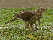 • In strict usage in Australia and Africa, to mean any of the species in the subfamily Accipitrinae, which comprises the genera Accipiter, Micronisus, Melierax, Urotriorchis and Megatriorchis. The large and widespread Accipiter genus includes goshawks, sparrowhawks, the Sharp-shinned Hawk and others. These are mainly woodland birds with long tails and high visual acuity, hunting by sudden dashes from a concealed perch.