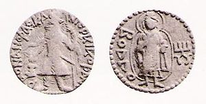 A Buddhist gold coin from India was found in northern Afghanistan at the archaeological site of Tillia Tepe, and dated to the 1st century CE. On the reverse, it depicts a lion in the moving position with a nandipada in front of it, with the Kharoṣṭhī legend "Sih[o] vigatabhay[o]" ("The lion who dispelled fear").