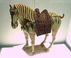 A Chinese Tang Dynasty tri-colored glaze porcelain horse (ca. 700 AD).