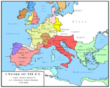 Map showing Europe in 526 AD with the three dominating powers of the west