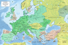 Map of Europe in 814, as the Frankish reached their peak, while Byzantium faced the Islamic conquest