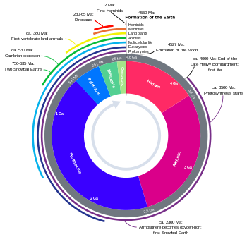 The following four timelines show the geologic time scale. The first shows the entire time from the formation of the Earth to the present, but this compresses the most recent eon. Therefore the second scale shows the most recent eon with an expanded scale. Finally, the second scale again compresses the most recent era, so the latest era is expanded in the third scale. Since the Quaternary is a very short period with short epochs, it is expanded in the fourth scale. The second, third, and fourth timelines are therefore each subsections of their preceding timeline as indicated by asterisks. The Holocene (the latest epoch) is too small to be shown clearly on the third timeline, another reason for expanding the fourth scale.