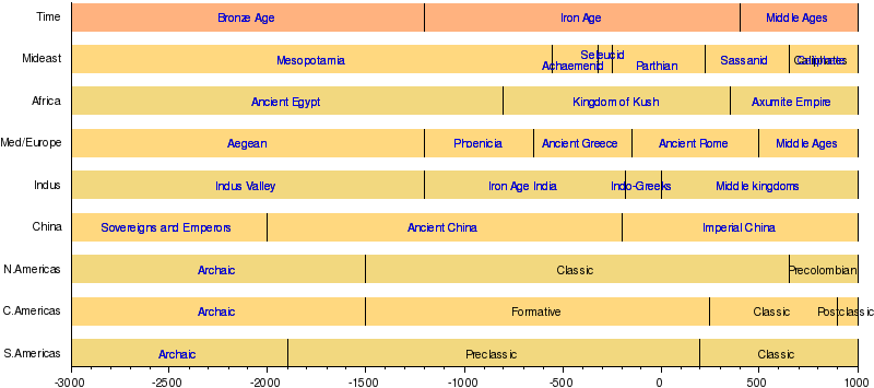 The Bronze Age is part of the three-age system ( Stone Age, Bronze Age, Iron Age) that for some parts of the world describes effectively the early history of civilization. During this era the most fertile areas of the world saw city states and the first civilizations develop. These were concentrated in fertile river valleys: The Tigris and Euphrates in Mesopotamia, the Nile in Egypt, the Indus in the Indian subcontinent, and the Yangtze and Yellow River in China.