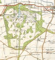 Work to the designs of William Kent on the Park commenced in 1729, several years before the house was constructed. This event was commemorated by the construction in 1730 of the obelisk, 80 feet (24 m) in height, standing on the highest point in the Park. It is located over half a mile to the south and on axis with the centre of the House. An avenue of trees stretches over a mile south of the obelisk. Thousands of trees were planted on what had been windswept land; by 1770 the park covered 1,500 acres (6.1 km2). Other garden buildings designed by Kent are, near the far end of the avenue the Triumphal Arch, designed in 1739 but only completed in 1752 and the domed doric Temple (1730–35) in the woods near the obelisk. Above the main entrance to the house within the Marble Hall is this inscription: