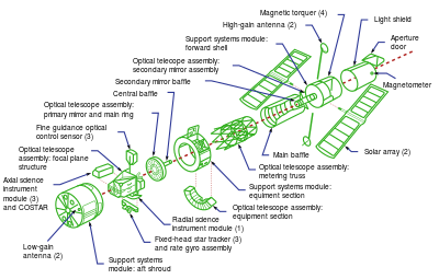 ![]() The Hubble Space Telescope as seen from the departing Space Shuttle Atlantis, flying Servicing Mission 4 ( STS-125), the fifth and latest human spaceflight to it.  |