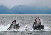 The humpback has the most diverse repertoire of feeding methods of all baleen whales. Its most inventive technique is known as bubble net feeding: a group of whales blows bubbles while swimming in circles to create a ring of bubbles. The ring encircles the fish, which are confined in an ever-tighter area as the whales swim in a smaller and smaller circles. The whales then suddenly swim upward through the bubble net, mouths agape, swallowing thousands of fish in one gulp. This technique can involve a ring of bubbles up to 30 m (100 ft) in diameter and the cooperation of a dozen animals. Some of the whales take the task of blowing the bubbles through their blowholes, some dive deeper to drive fish toward the surface, and others herd fish into the net by vocalizing. Humpbacks have been observed bubblenet feeding alone as well.
