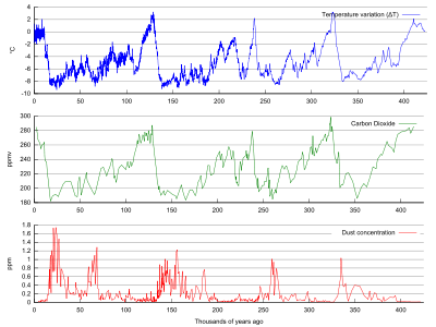 Isotopic analysis of the ice in the core can be linked to temperature and global sea level variations. Analysis of the air contained in bubbles in the ice can reveal the palaeocomposition of the atmosphere, in particular CO2 variations. There are great problems relating the dating of the included bubbles to the dating of the ice, since the bubbles only slowly "close off" after the ice has been deposited. Nonetheless, recent work has tended to show that during deglaciations CO2 increases lag temperature increases by 600 +/- 400 years. Beryllium-10 concentrations are linked to cosmic ray intensity which can be a proxy for solar strength.