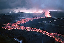 Iceland is one of the most active volcanic regions in the world, with eruptions occurring on average roughly every five years. About a third of the basaltic lavas erupted in recorded history have been produced by Icelandic eruptions. Notable eruptions have included that of Eldgjá in 984 (the world's largest basaltic eruption ever witnessed), Laki in 1783 (the world's second largest), and several eruptions beneath ice caps, which have generated devastating glacial bursts, most recently in 1996.