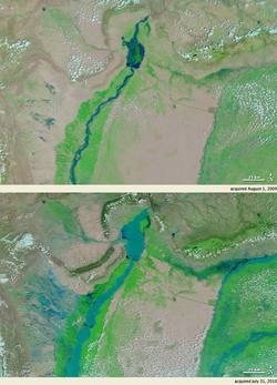 Satellite images of the upper Indus River valley, comparing water-levels on 1 August 2009 (top) and 31 July 2010 (bottom)