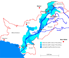 The 2011 Sindh floods began during the Pakistani monsoon season in mid-August 2011, resulting from heavy monsoon rains in Sindh, eastern Balochistan, and southern Punjab. The floods caused considerable damage; an estimated 434 civilians were killed, with 5.3 million people and 1,524,773 homes affected. Sindh is a fertile region and often called the "breadbasket" of the country; the damage and toll of the floods on the local agrarian economy was said to be extensive. At least 1.7 million acres (690,000 ha; 2,700  sq mi) of arable land were inundated. The flooding followed the previous year's floods, which devastated a large part of the country. Unprecedented torrential monsoon rains caused severe flooding in 16 districts of Sindh.